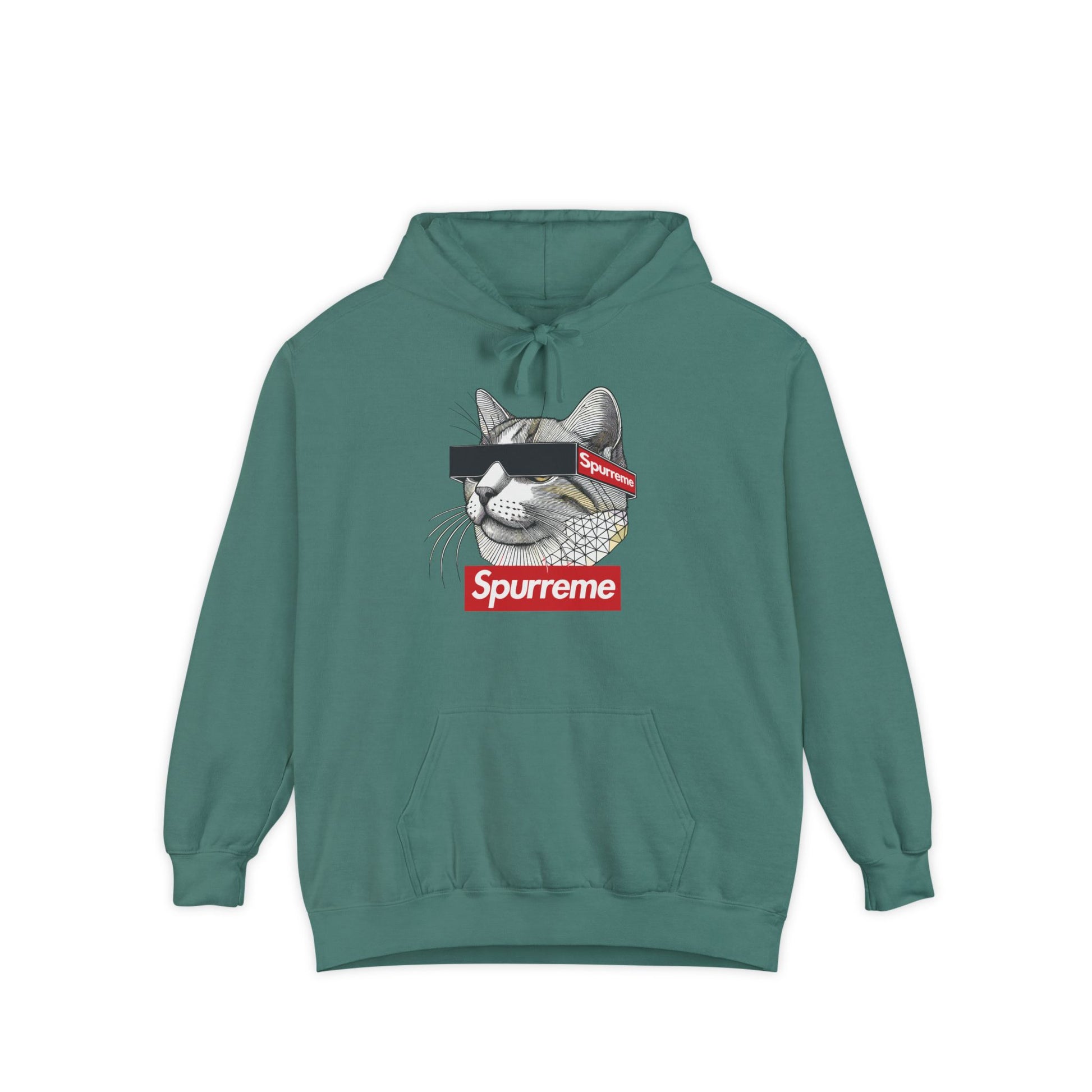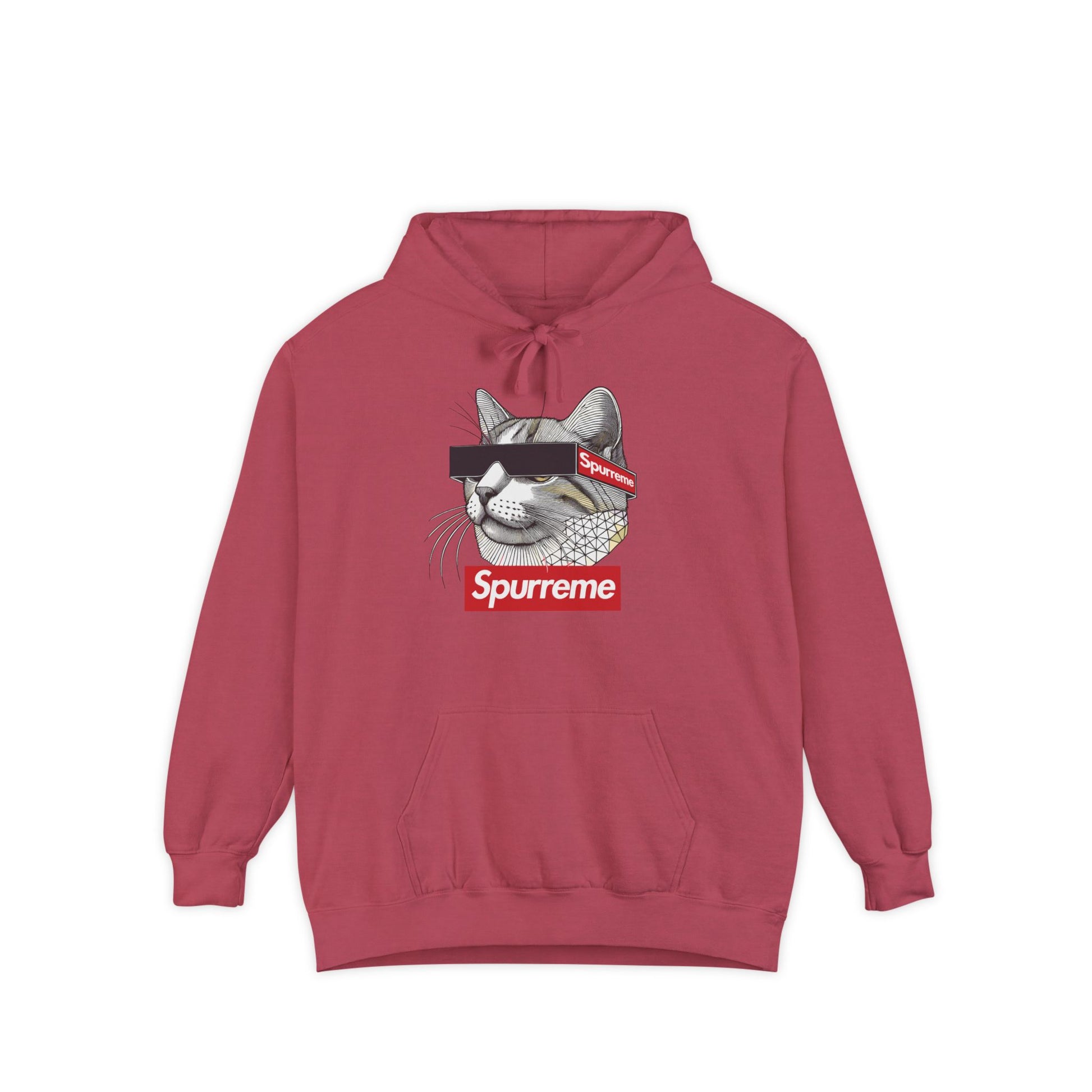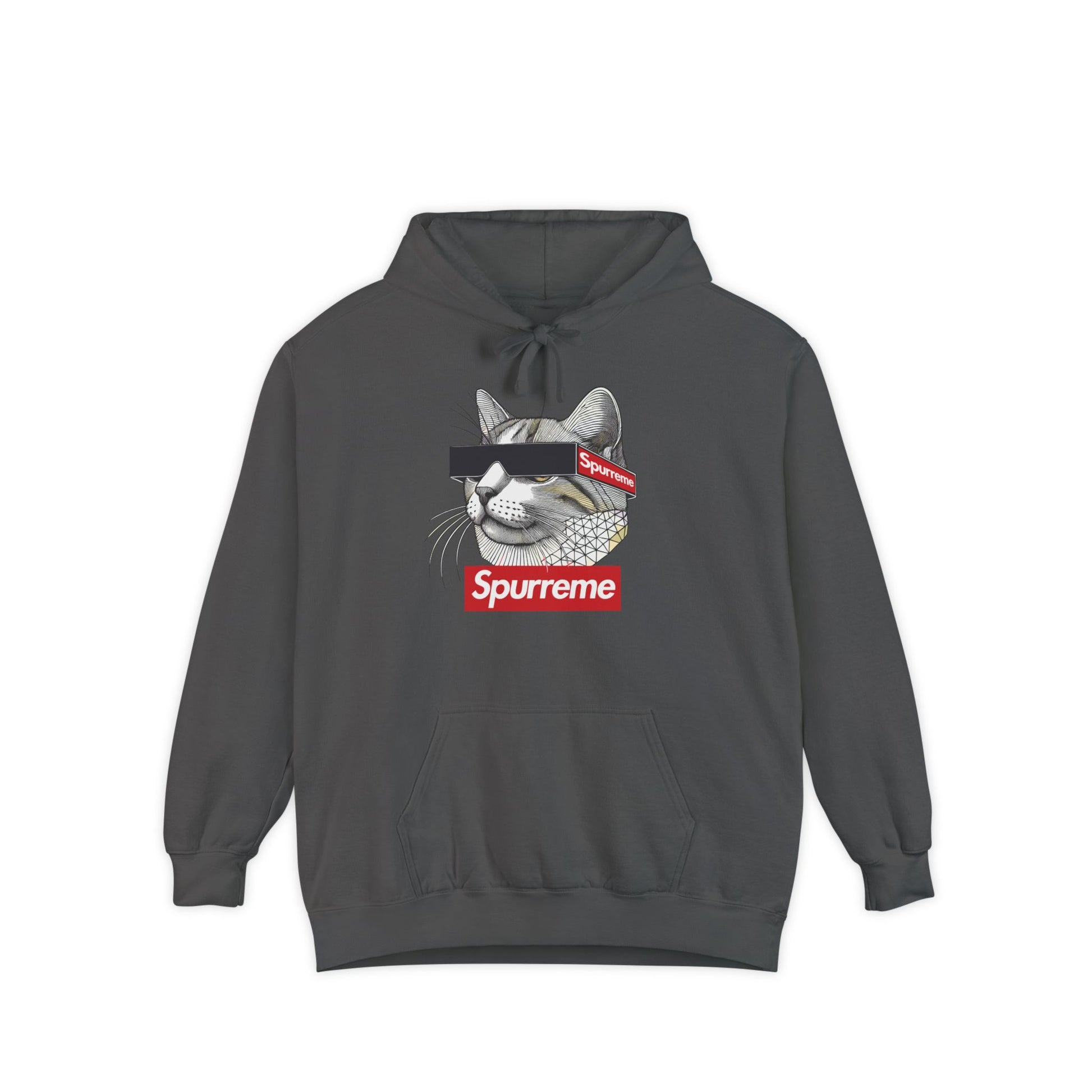 Geometry. Authority. Whiskers. This heavyweight Spurreme hoodie blends feline dominance and abstract edge in rich garment-dyed color and bold print clarity.
