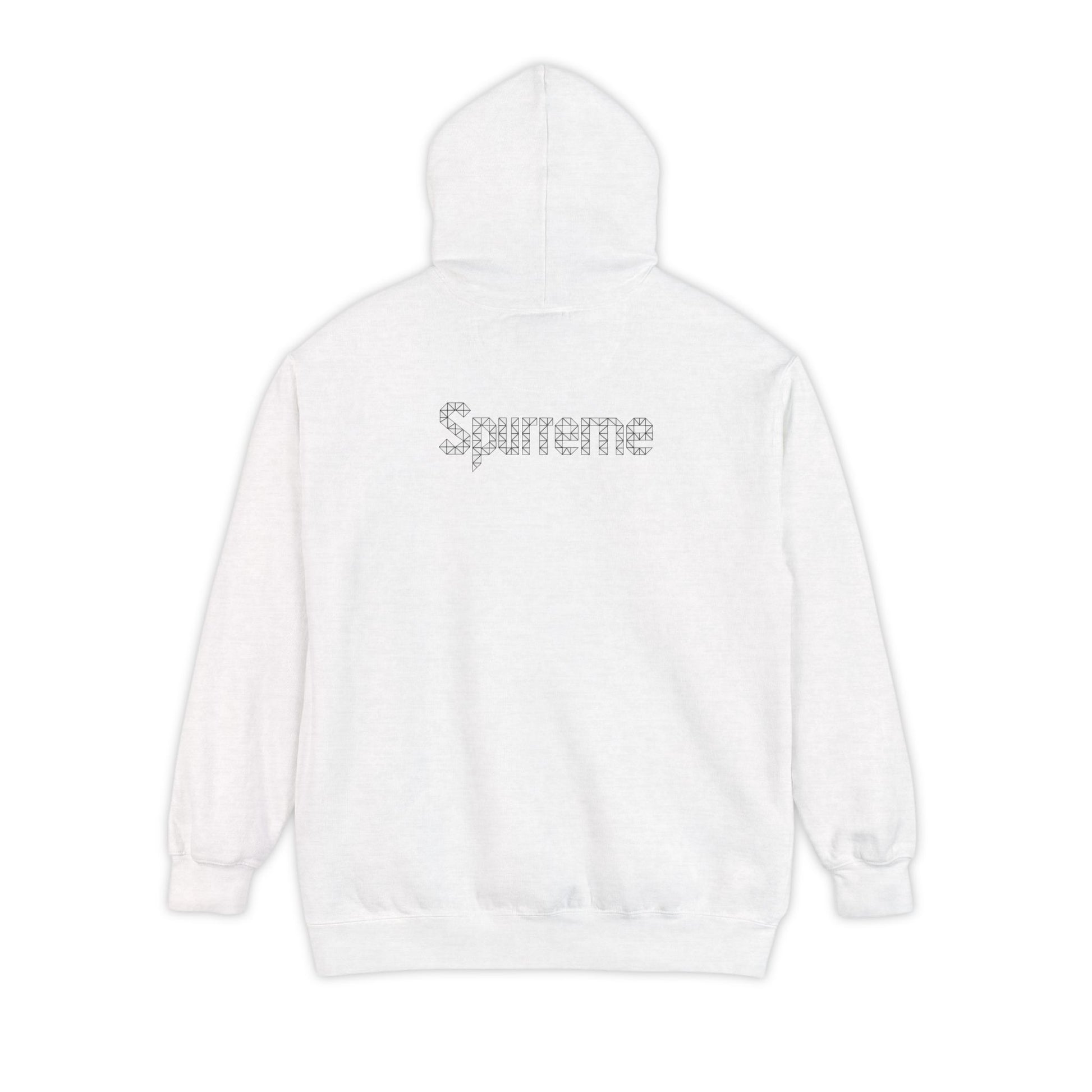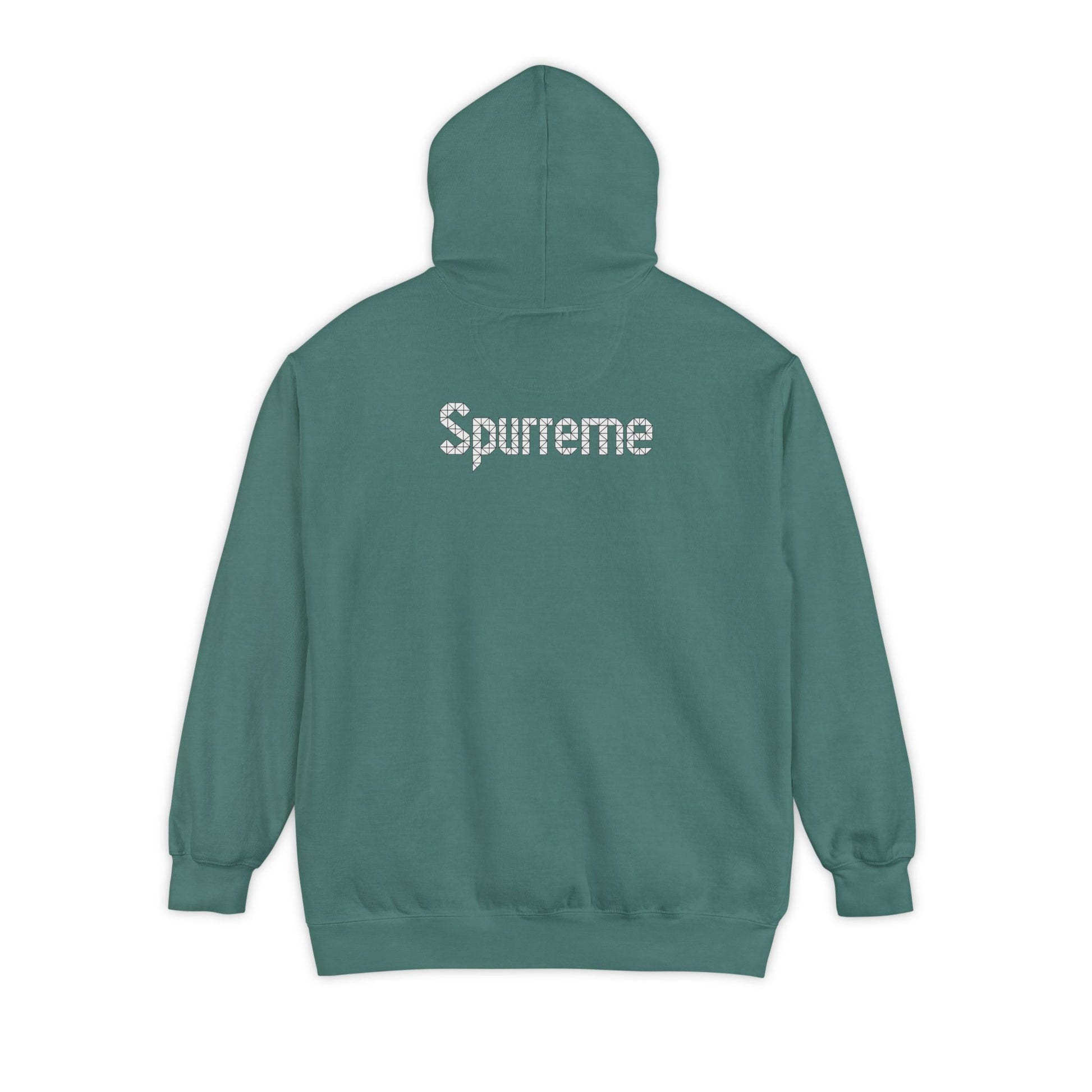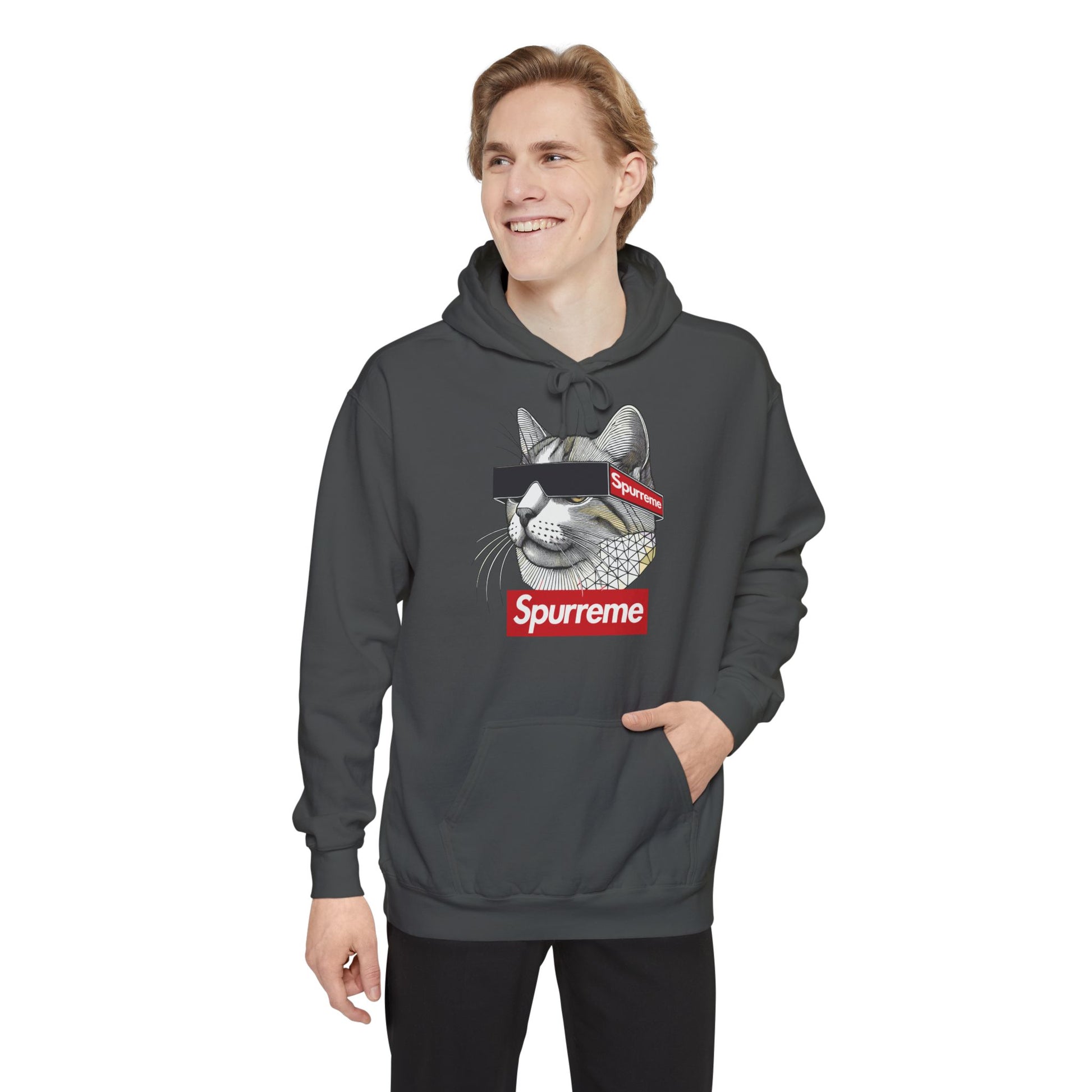 Geometry. Authority. Whiskers. This heavyweight Spurreme hoodie blends feline dominance and abstract edge in rich garment-dyed color and bold print clarity.